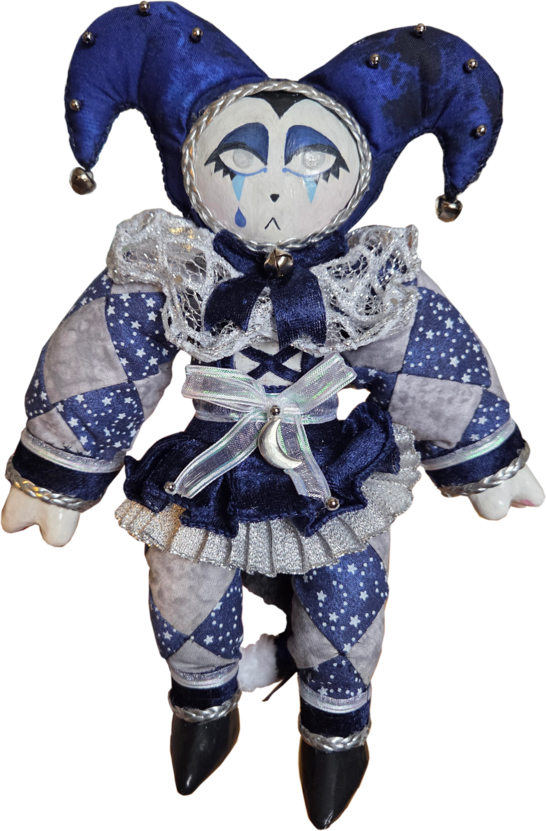 okay the art doll thing i made for my mom's birthday with polymer clay, aluminum foil, armature wire, paint, fabric, and stuffing. and the acessories the beads and stuff. he has a little tail also. the arms, legs, and tail are posable. the head can kinda be posed.